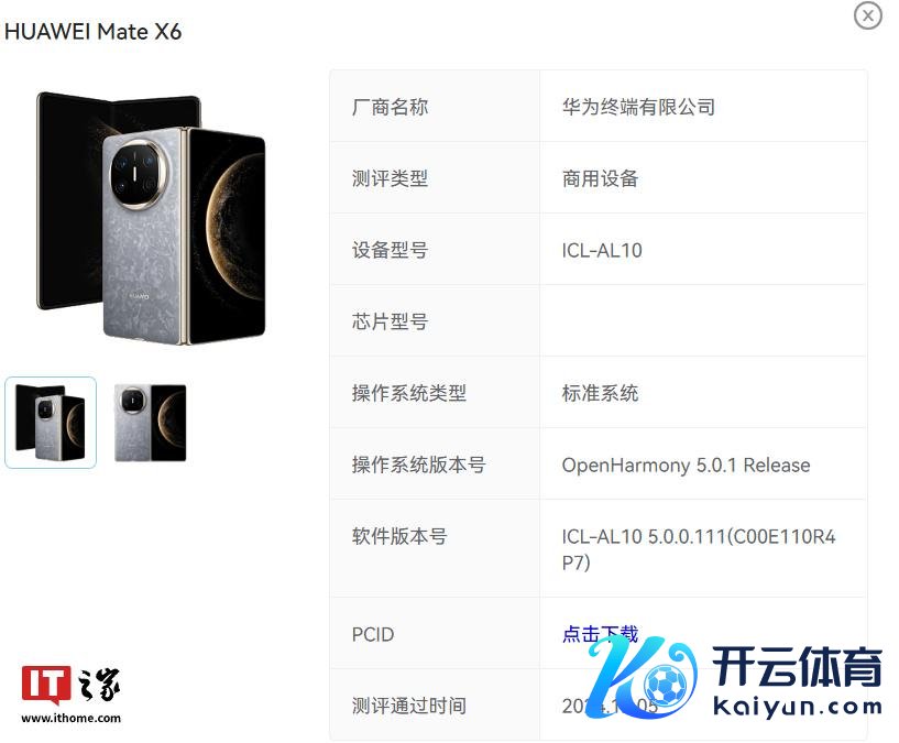 IT之家 12 月 8 日音问,在本年 11 月的 Mate 品牌盛典上,华为 Mate 70 系列旗舰手机考究发布,新机全系救济星闪时间,堪称“史上最强悍的 Mate”体育游戏app平台,订价 5499 元起。 IT之家注重到,华为 Mate X6 折叠屏手机初次通过了开源鸿蒙兼容性测评,相关信息走漏,其操作系统版块号为 OpenHarmony 5.0.1 Release,软件版块号为 ICL-AL10 5.0.0.111(C00E110R4P7)。 另外,华为 Mate 70、Mate 7