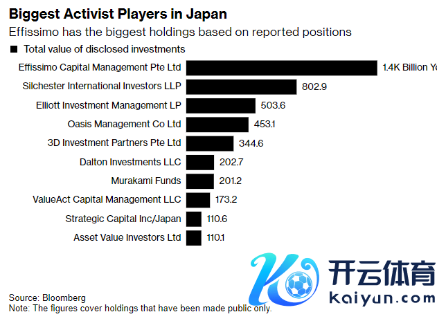 最大的单一激进投资者是Effissimo Capital Management Pte,该公司捏有航运公司川崎轮船株式会社(Kawasaki Kisen Kaisha Ltd.)、保障公司第一世命保障株式会社 (Dai-ichi Life Holdings Inc.)和复印机制造商理光公司(Ricoh Co.)的深广股份。