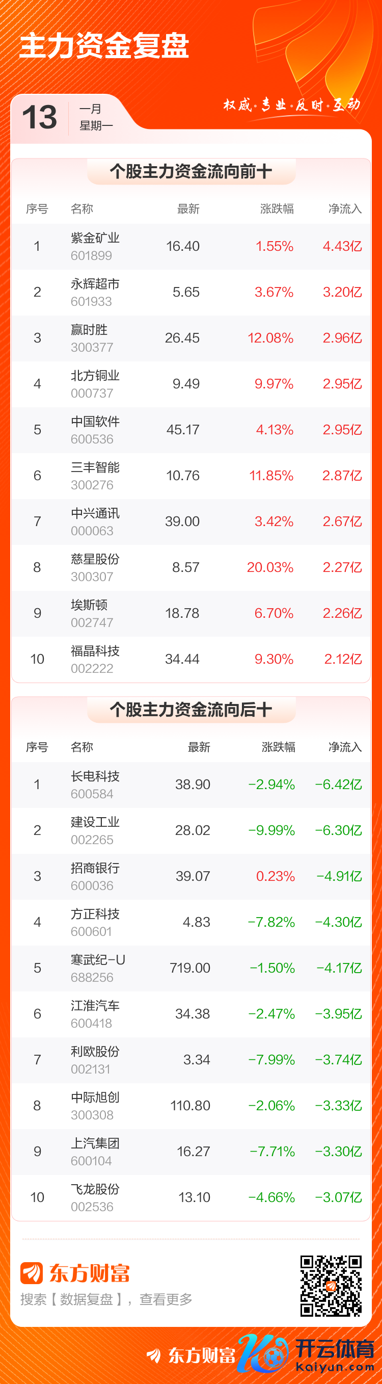1月13日,沪指跌0.24%,深成指涨0%,创业板指涨0.36%。两市成交额9663.77亿,较上个往将来缩量1819亿。数据暴露,当天大盘主力资金净流出207.47亿。有色金属、动力金属、石油行业等板块主力资金流入排行居前,其中有色金属净流入10.19亿元。 主力净买入个股中,紫金矿业排行第一,主力净买入4.43亿元;永辉超市排行第二,主力净买入3.20亿元。 主力净卖出个股中,长电科技排行第一,主力净卖出6.42亿元;建造工业排行第二,主力净卖出6.30亿元。 免责声明:本文基于AI出产,