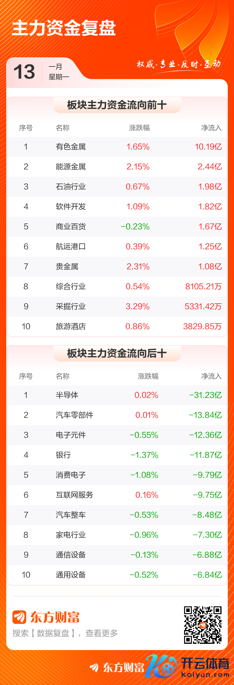 1月13日,沪指跌0.24%,深成指涨0%,创业板指涨0.36%。两市成交额9663.77亿,较上个往将来缩量1819亿。数据暴露,当天大盘主力资金净流出207.47亿。有色金属、动力金属、石油行业等板块主力资金流入排行居前,其中有色金属净流入10.19亿元。