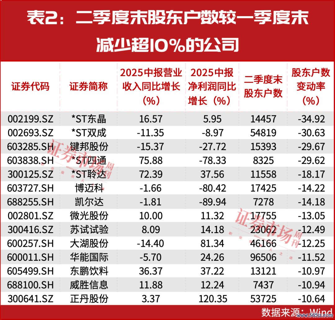 除了表示论述期内功绩的变动,中报还公示了上市公司二季度末的推动户数、机构执仓等数据。推动户数减少时时反馈股票筹码辘集度提高,可能伴跟着机构的吸筹,现在94家公布肃肃中报的公司中,剔除时间股本发生变动的个股,41家二季度末推动户数较一季度末减少,执股筹码辘集度提高,14家减少幅度进步了10%(见表2)。