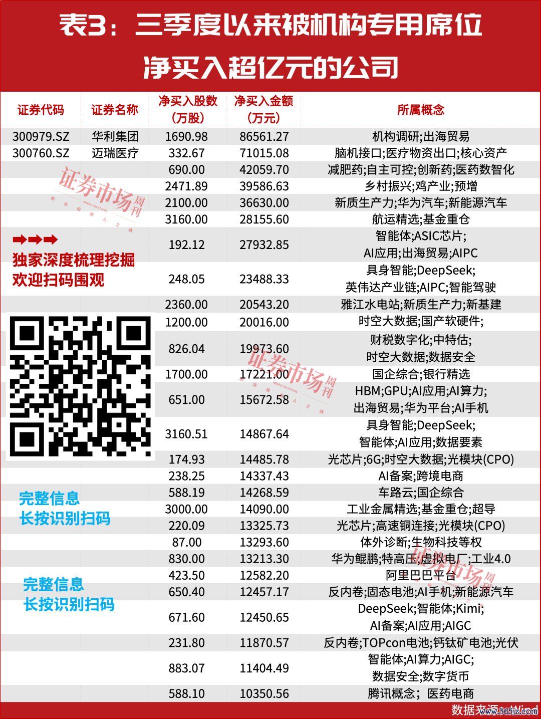 干涉三季度以来,现在已有235家公司的巨额来去中,接盘方出现了机构专用席位的身影,其中,218家公司时间被机构专用席位试验了净买入操作,27家公司净买入金额超亿元(见表3,读者一又友可扫描二维码“加入学习”免费领取完好数据)。