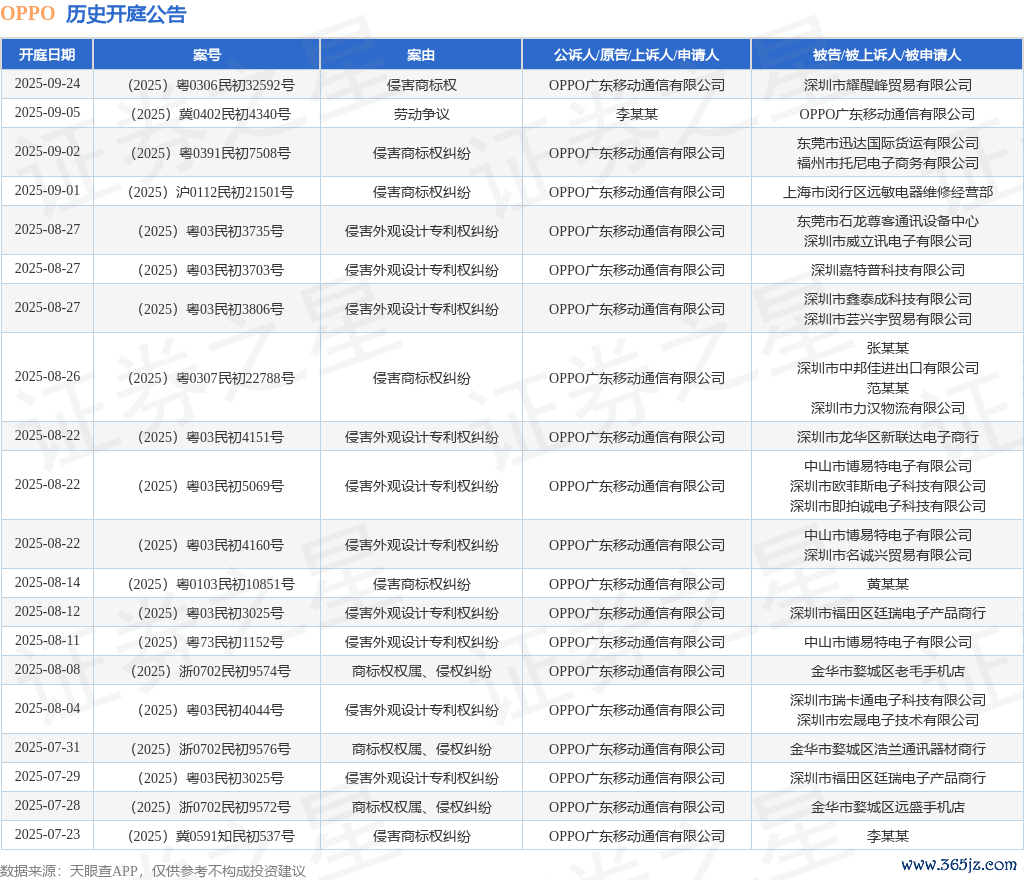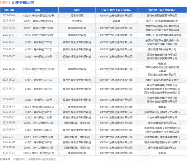 案号:(2025)粤03民初3025号审理法院:广东省深圳市中级东说念主民法院案由:侵害外不雅策画专利权纠纷当事东说念主信息: 原告/上诉东说念主:OPPO广东挪动通讯有限公司 被告/被上诉东说念主:深圳市福田区廷瑞电子居品商行开庭日历:2025年8月12日字据统计,近一年内以OPPO广东挪动通讯有限公司为当事东说念主的历史开庭公告有128则,其中案由为“侵害商标权纠纷”的公告以82则居首,其次为“侵害外不雅策画专利权纠纷”有15则,“相聚不正大竞争纠纷”有12则。历史开庭公告(前20条)如下: