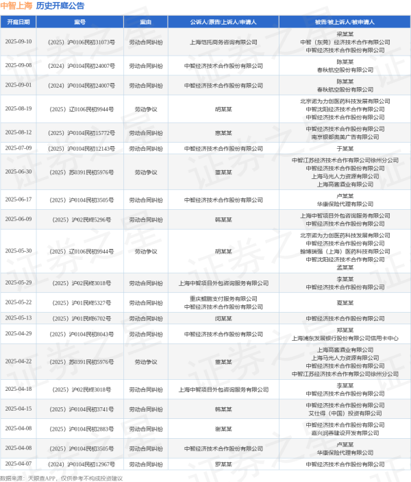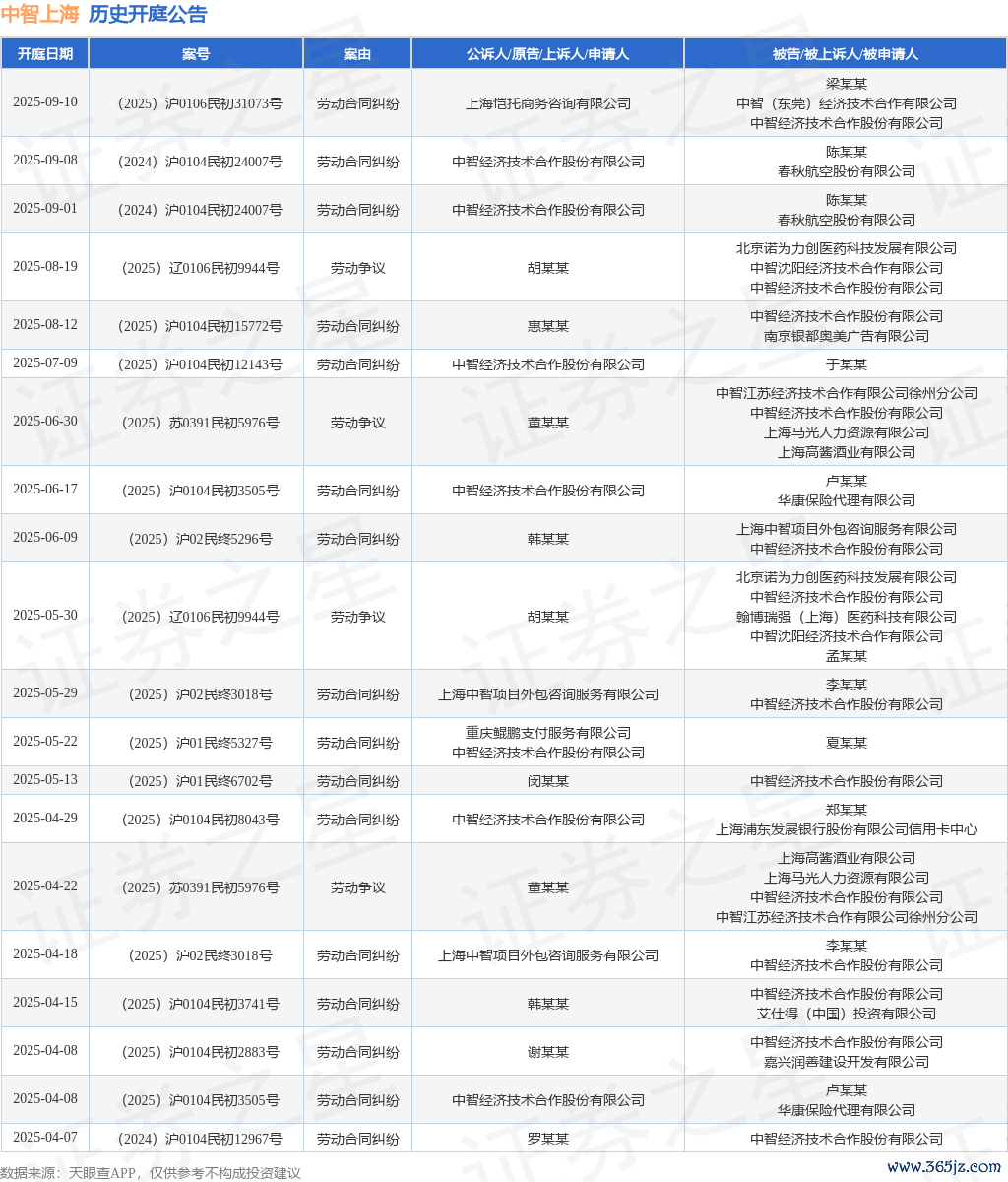 案号:(2025)沪0104民初15772号审理法院:上海市徐汇区东谈主民法院案由:行状条约纠纷当事东谈主信息: 原告/上诉东谈主:惠某某 被告/被上诉东谈主:中智经济工夫讨好股份有限公司、南京银齐奥好意思告白有限公司开庭日历:2025年8月12日左证统计,近一年内以中智经济工夫讨好股份有限公司为当事东谈主的历史开庭公告有56则,其中案由为“行状条约纠纷”的公告以38则居首,其次为“行状争议”有13则,“工伤保障经验好像待遇认定”有2则。历史开庭公告(前20条)如下: