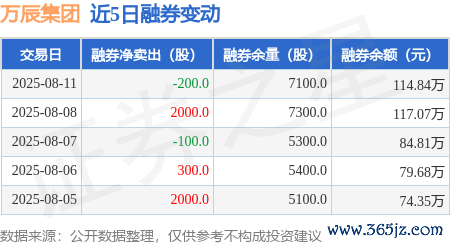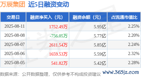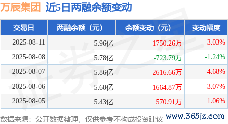 本站音书云开体育,8月11日,万辰集团(300972)融资买入4820.89万元,融资偿还3068.41万元,融资净买入1752.49万元,融资余额5.95亿元,近20个交游日中有16个交游日出现融资净买入。